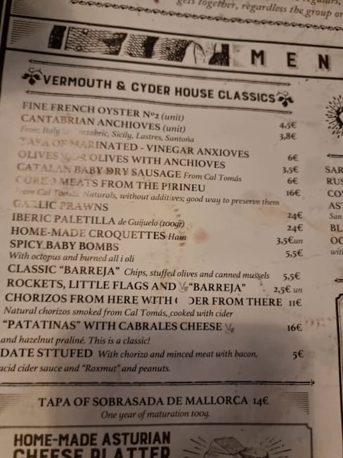 10/10We were running late but the hotel called ahead and El Chigre 1769 honoured our booking. The staff were very friendly and knowledgeable. they recommended great dishes. We also tried the house vermouth. The atmosphere was vibrant and it was noted that people kept trying to enquire if there were tables free. I strongly recommend booking.
