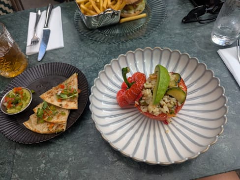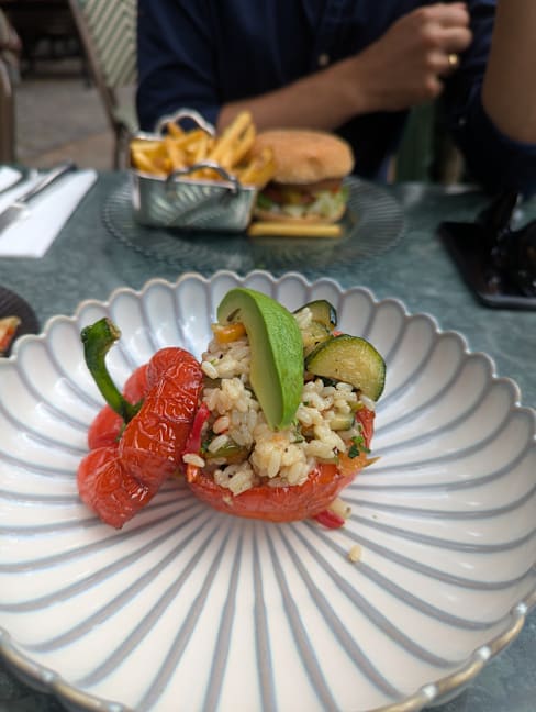 7.5/10The food (quesadilla and risotto filled peppers) tastes very good, but the vegan burger of my husband was a bit disappointing. Sadly, the portion sizes are very small for the price. It's ok for -50% discount but not for the regular price. The staff is very nice and the terrace is cozy and comfortable.