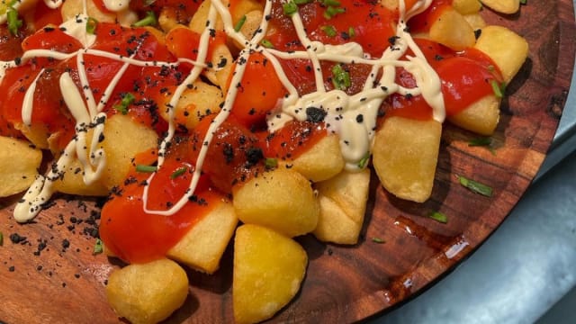 Patatas crujientes por fuera, tiernas por dentro, con salsa picante.