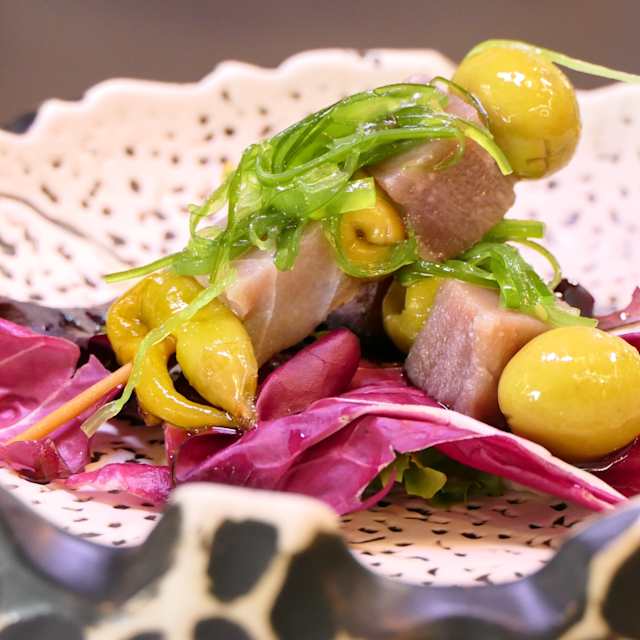 - Ensalada de salmón marinado con guacamole y vinagreta de naranja