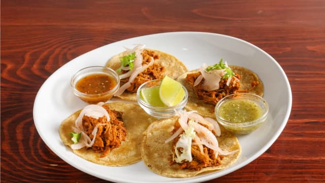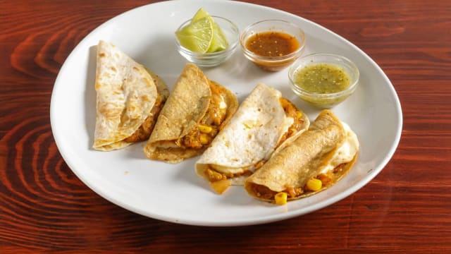 Con 4 tortitas, 4 filates, pico de gallo, aguacate y croma ágria