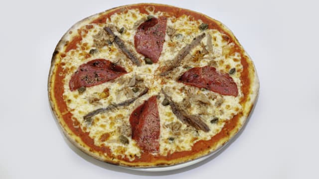 Tomate, mozzarella, cebolla, alcaparras, anchoas y olivas