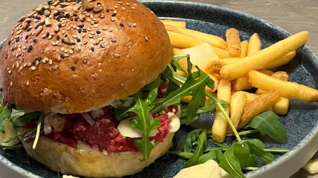 Pane fresco forneria coffinardi, 200g di tartare di manzo al naturale, rucola fresca, salsa tartara, grana a scaglie, cipolla di tropea
