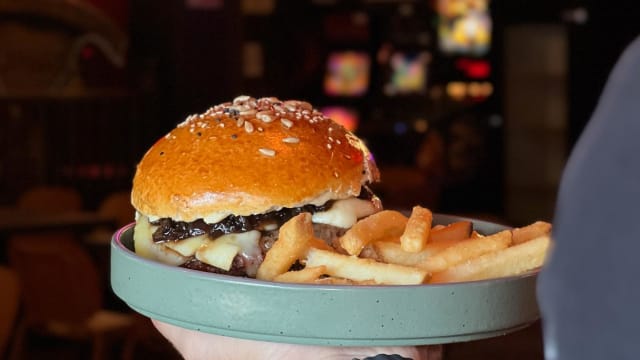 Pane senza glutine e senza lattosio hamburger galiziano 220g, doppio cheddar, pancetta nostrana croccante, salsa tartara e cipolla caramellata servito solo con patate al forno