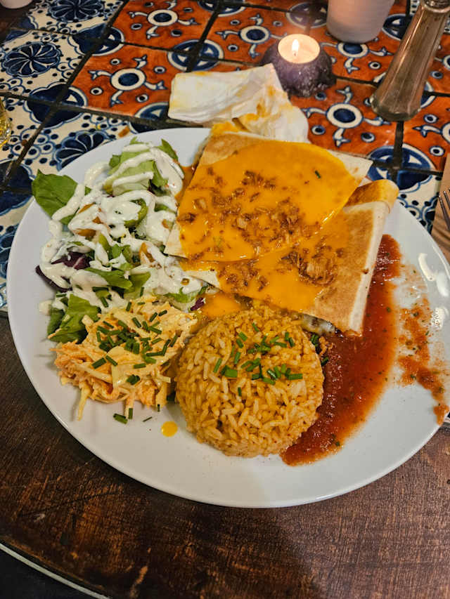 Burrito frit nappé de sauce cheddar au bœuf/ poulet/ mixte/ végétarien, coleslaw, pico de gallo, garni riz parfumé