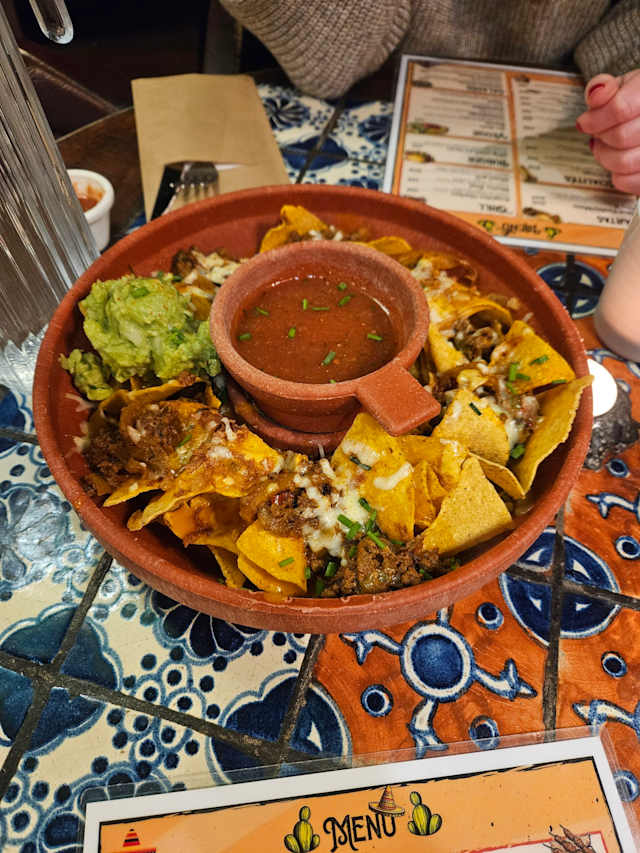 Tortillas de maïs nappées de sauce cheddar au bœuf/poulet/mixte/végétarien, coleslaw, pico de gallo, garnies riz parfumé
