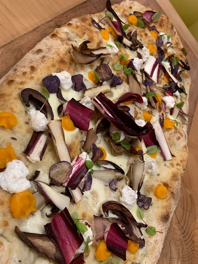 Pomodoro, fiordilatte, porchetta, topinambur, giardiniera con cipolla in carpione