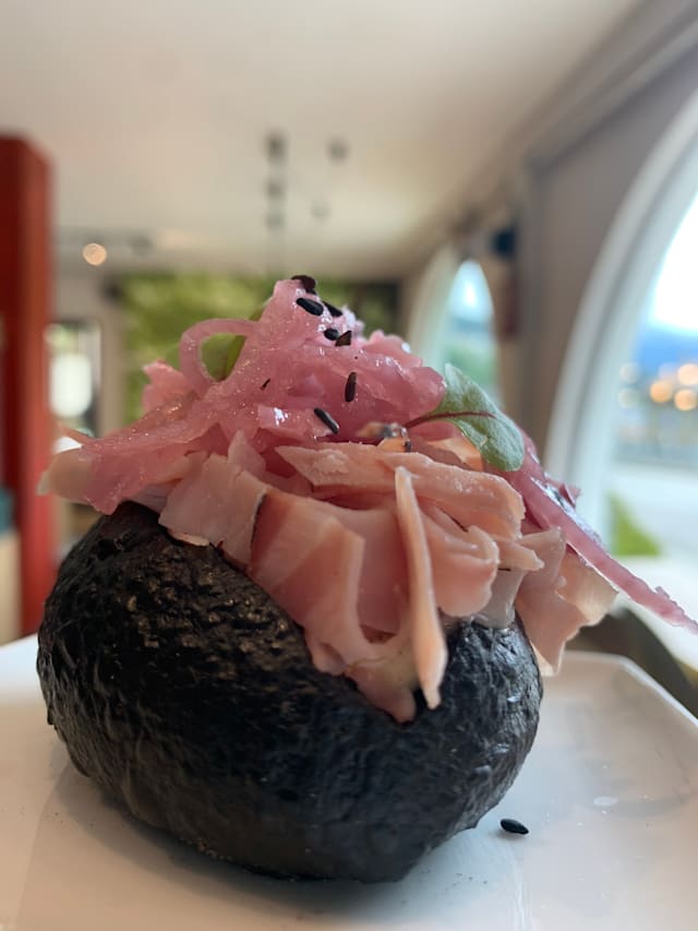 Un cicchetto veneziano vestito sexy, con impasto al nero di seppia, baccalà mantecato e germoglio di porro