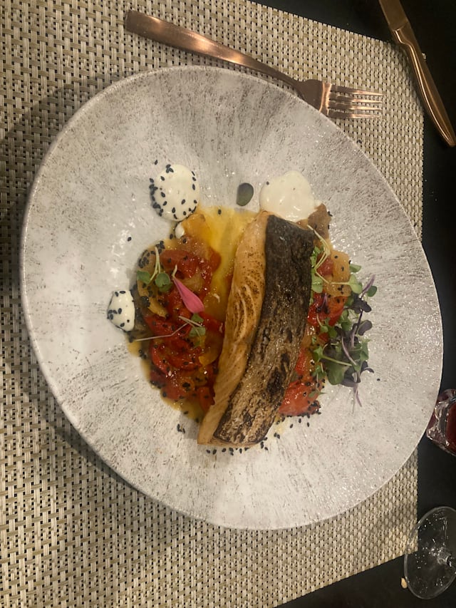 Lomo de salmón a la brasa con escalibada y mahonesa japonesa