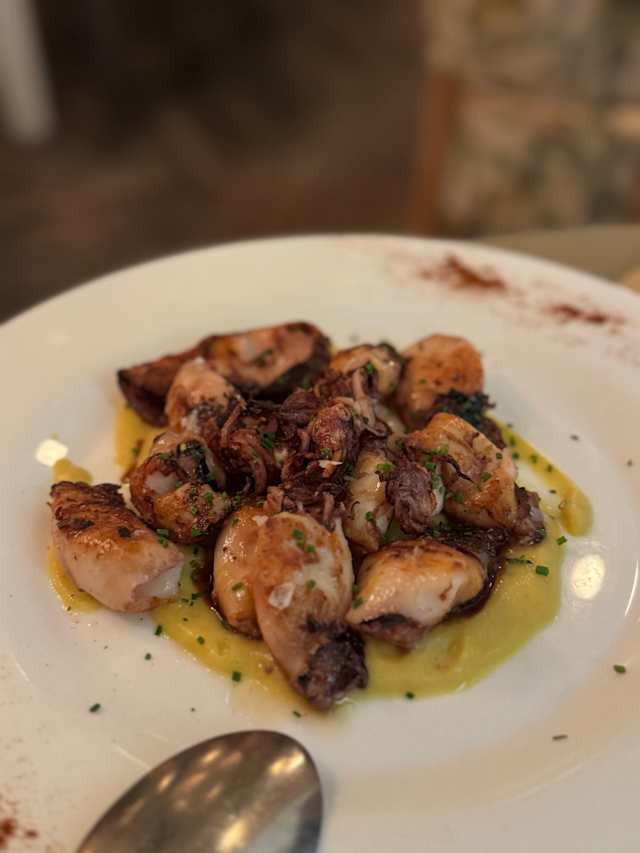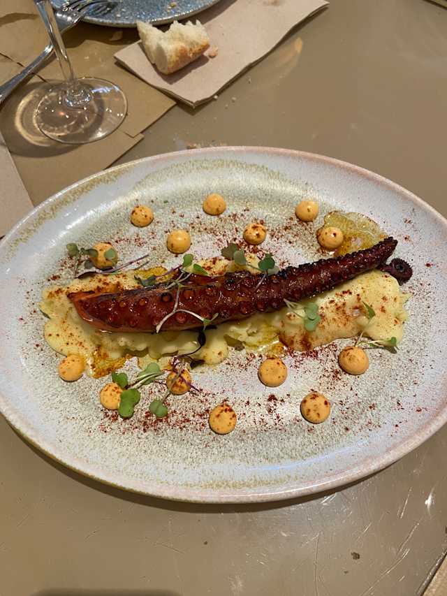 - Pulpo a la parrilla con patata revolcona y pimientos de padrón