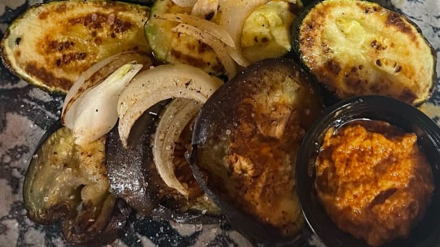 Parrillada De Verduras De Temporada Con Romesco De Tomate Y Sal Rosa Del Himalaya
