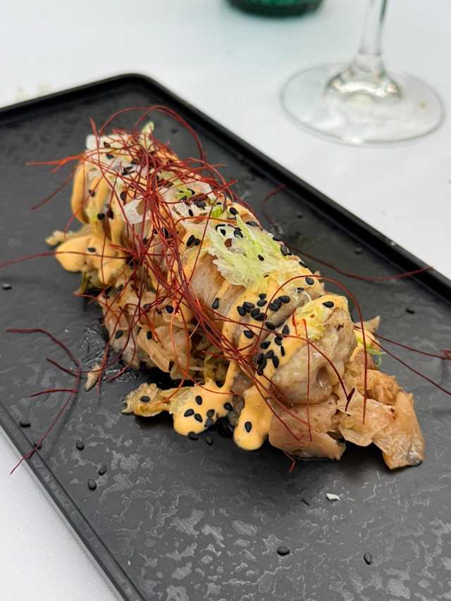 - Tartar de atún de almadraba con jugo de gildas y migas en tempura