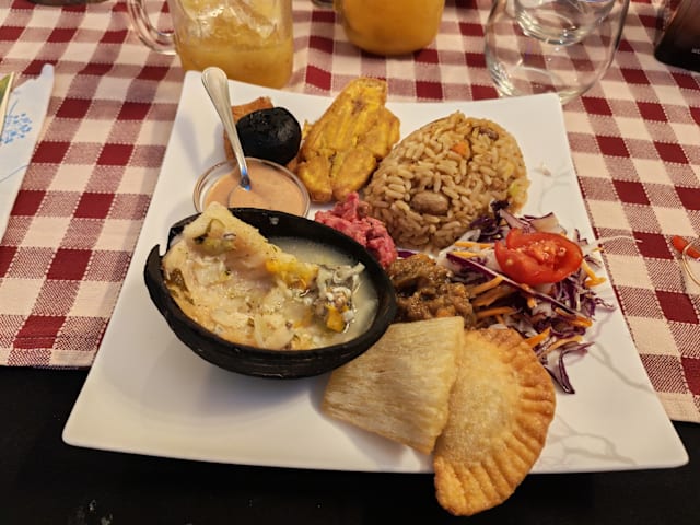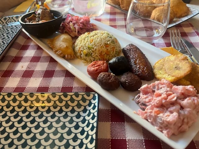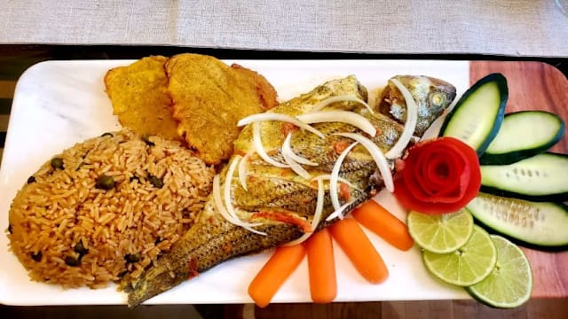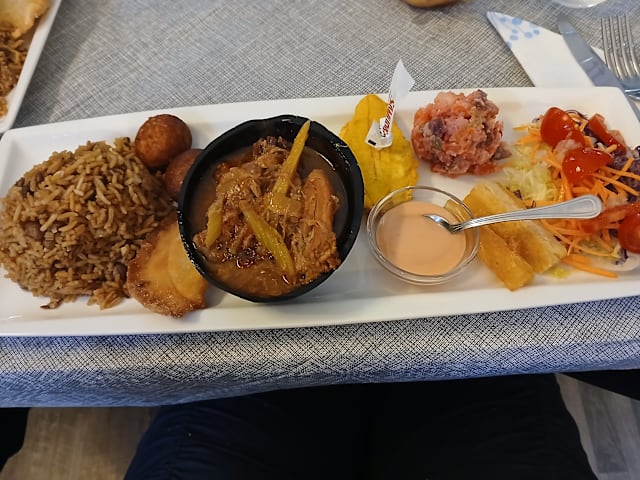 Riso champignon haitano, pollo, manzo o maiale, banana pesce, pikliz e insalata mista.