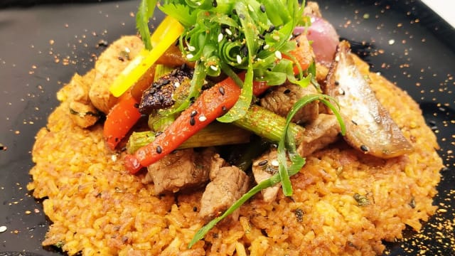 Carne salteada al wok con arroz, verduritas, huevo y salsa de soja.