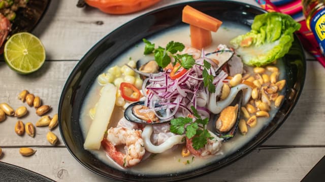 Base de papa amarilla,limón, aji amarillo, huevo cocido y aceitunas negras, acompañado con el clásico ceviche peruano.