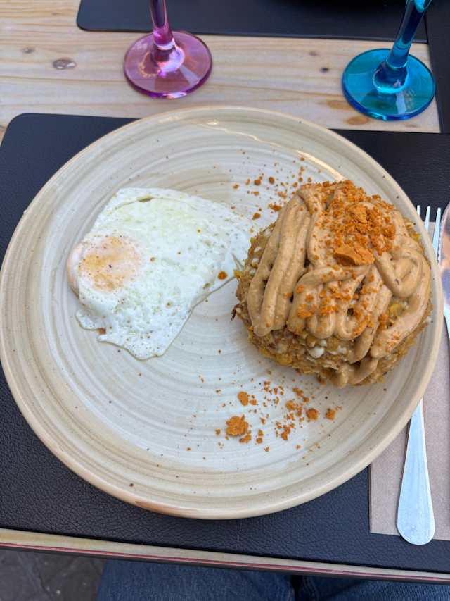- Carne de cerdo, chorizo, salsa de maní, mote, torta de patata, huevo y ensalada.
