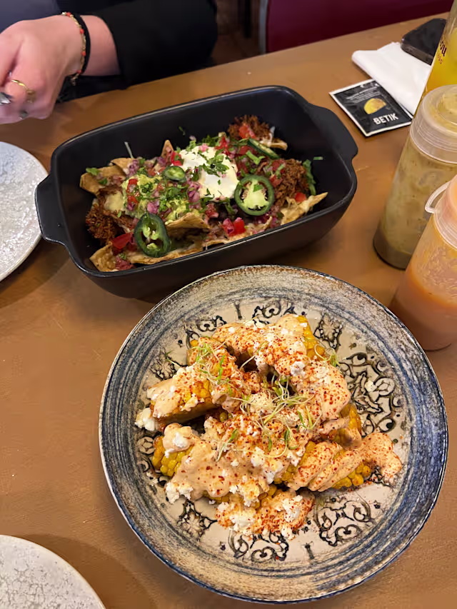 - Totopos caseros gratinados con queso mozzarella con carne de birria, cochinita o tinga de pollo a elegir. Acompañados de alubias negras. Guacamole, crema agria, pico de gallo y jalapeños frescos.