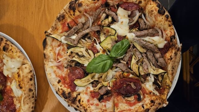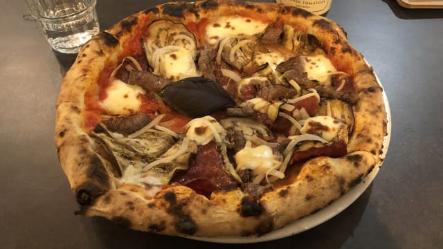 Pulpe de tomate, avec ou sans mozza fior di latte, courgettes et aubergines grillées, champignons de paris frais, poivrons, oignons, basilic