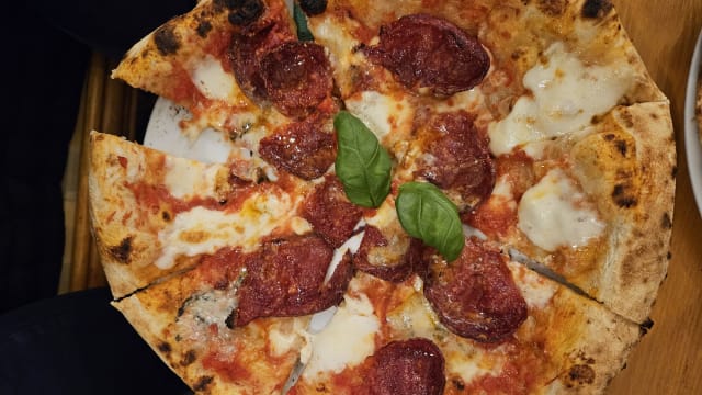 Pulpe de tomate, mozza fior di latte, salami spianata (ça pique un peu), basilic