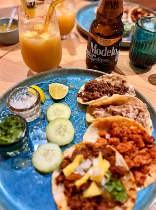 - Tortillas de maïs garnies au choix: pastor, pastor de pollo halal, longaniza de soya, birria, carnitas, suadero