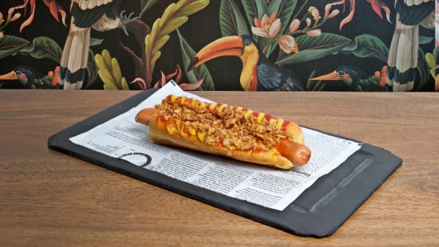 Salchicha, mayonesa, pepinillos en tartar, maíz, cebolla roja encurtida y cebolla crispy