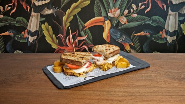 Carne mechada de ternera, tomate semiseco, confitura de pimientos rojos, cebolla roja encurtida,rúcula y mayonesa chipotle