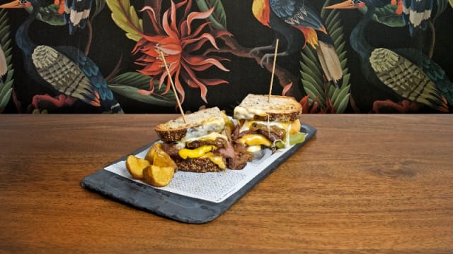 Pastrami, salsa de mostaza ligera, pepinillos, queso havarti, queso idiazabal y rúcula