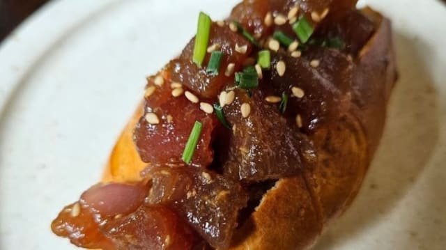 Tosta de sobrasada, queso viejo y mermelada de violetas