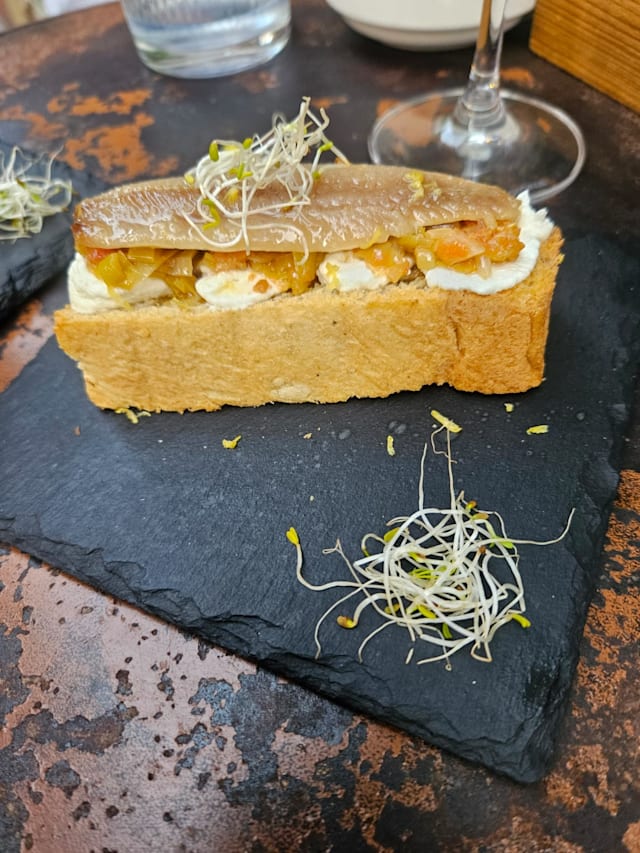 Queso crema, puerro, tomate confitada y lomo de sardina