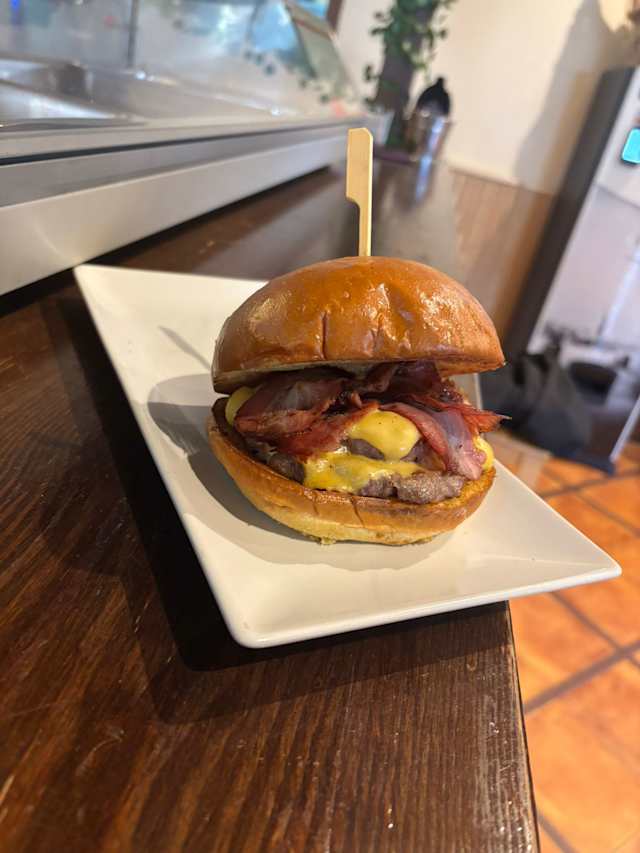 - Doble carne, Queso de cabra, Cecina, cebolla caramelizada.