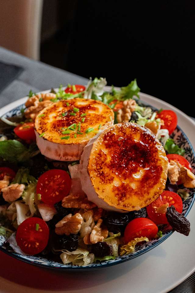 - House favorite salad with arugula, lettuce, brown sugar caramelized goat cheese, walnuts, toasted raisins, figs, and our homemade vinaigrette
