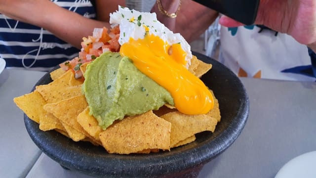With guacamole, cheddar sauce and pico de gallo