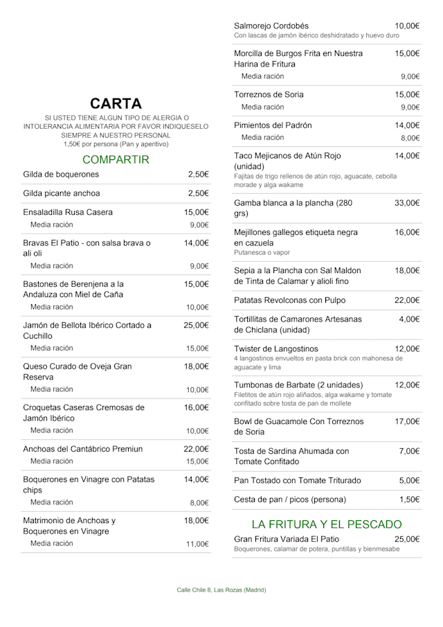 En El Patio, la calidad de la materia prima es nuestro sello. Cada plato está elaborado con productos nacionales seleccionados con esmero, respetando la esencia de la cocina casera tradicional española. Nuestra carta, amplia y var...