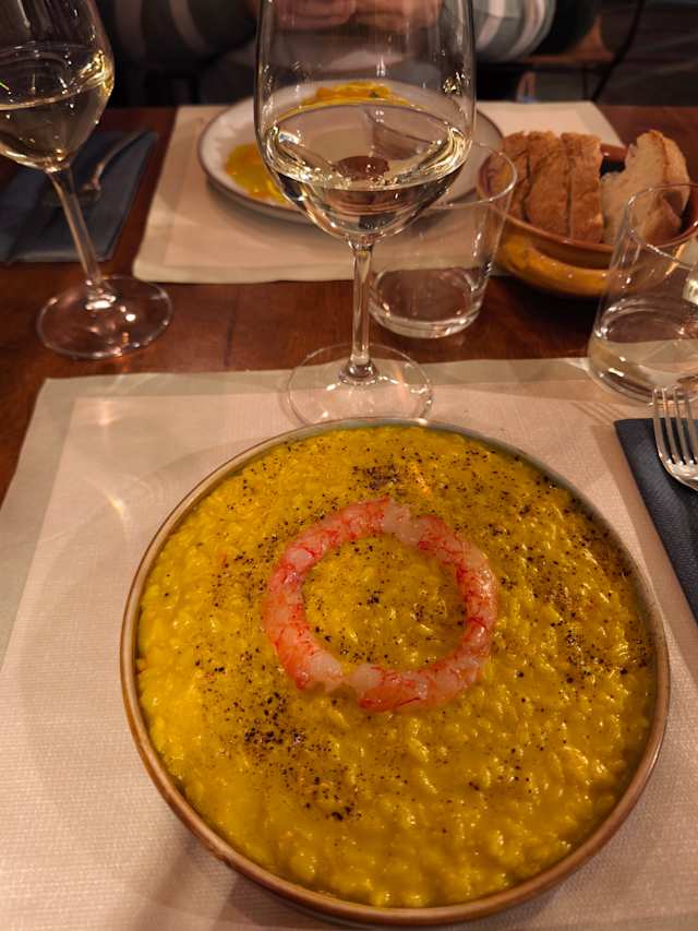- Riso ai pistilli di zafferano, gamberi rossi a crudo e spolverata di liquerizia