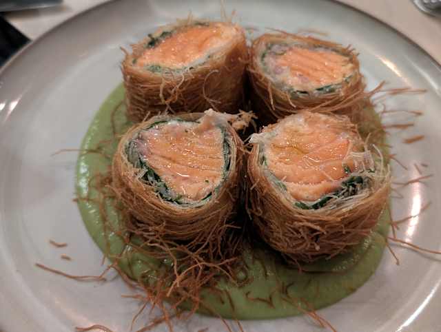 - Gamberi in porchetta, crema di fagioli, carciofi scottati al timo su nido di kataifi
