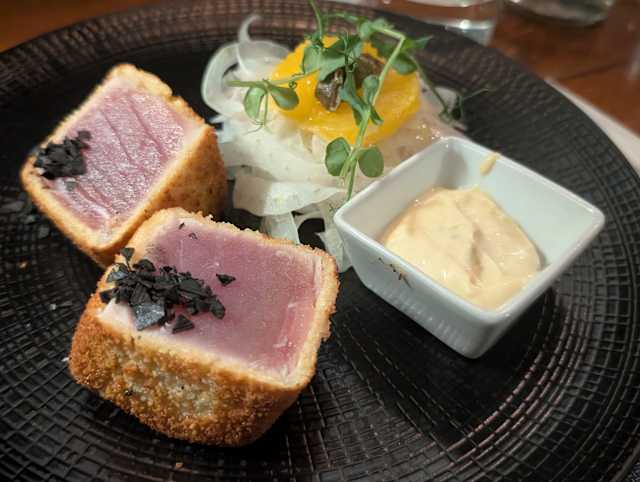 - Milanese di tonno con doppia impanatura, insalatina di finocchi freschi e arance, maionese alla bottarga