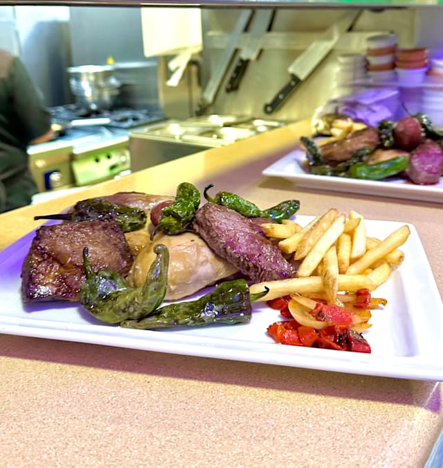 Cerdo, ternera, pollo, chorizo criollo, papas fritas pimiento asado, pimiento de padrón, salsa argentina chimichurri