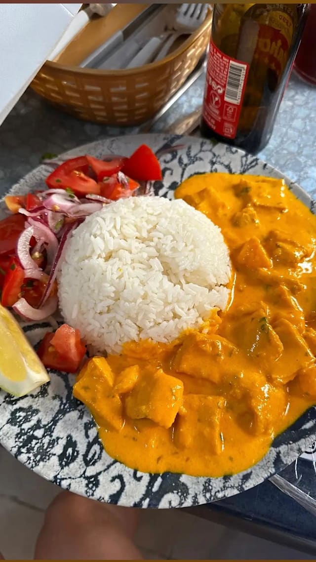 Camarones cocidos en una salsa cremosa de coco, servidos con una ración de arroz para equilibrar los sabores