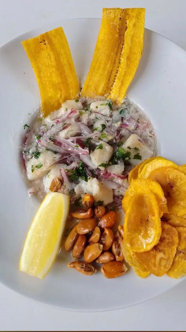 Trozos de pescado marinados en jugo de limón, servidos con un acompañamiento de arroz, fresco y vibrante