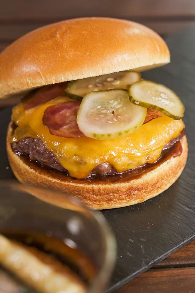- Con cheddar, bacon, pepinillo y salsa barbacoa.