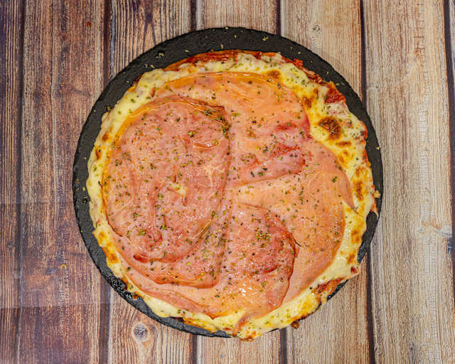 - Salsa de tomate, muzzarella, jamón cocido, pimiento, ají asado y orégano