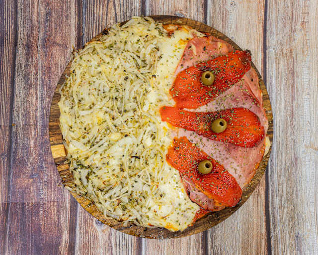 - Salsa de tomate, muzzarella, jamón cocido, óregano y aceitunas verdes