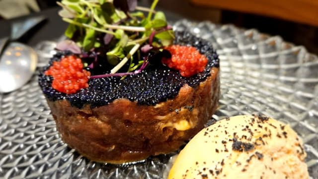 Tartar de atún balfegó con helado de tomate maduro y aceite de oliva
