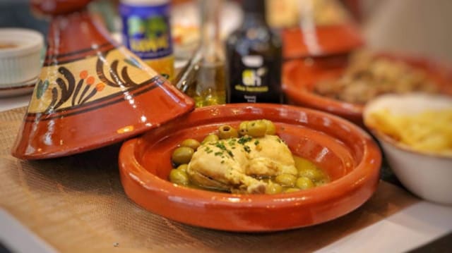 Tipico del magreb, con especias árabes, almendras, ciruelas, sésamo, huevo duro y cebolla caramelizado