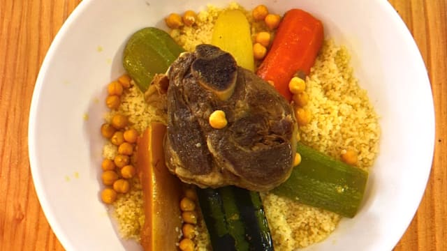 Especialidad berber con sémolo, verduras de temporado, garbanzos, pasas dulces (opcional), caldo de verduras y croqueta de falafel.
