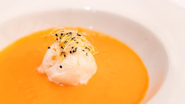 - Salmorejo con virutas de jamón ibérico y aceite de oliva arbequina
