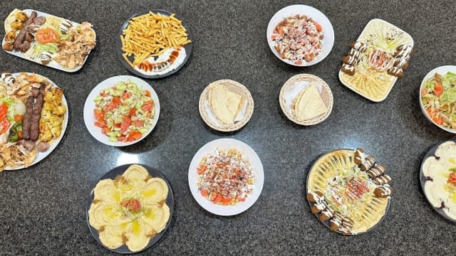 (kafta), Shawarma de pollo, Humus, Mutabal, 2 croquetas de falafel,