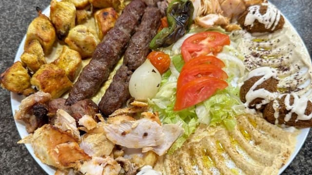 1 pincho de pollo, 1 pincho de carne, pincho de carne picada (kafta), Shawarma de pollo, Lechuga.