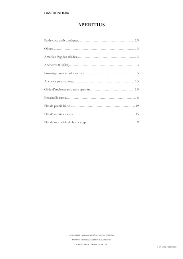 CatalanEuropeanSpanishCroquettesOmelettePastaSeafood platterTartar steakBirthdayBookable terraceFrom marketGood for a business lunchGood for familiesGood for groupsKid-friendlyLunchOutdoor diningRomanticWine barWinter terraceWith friendsNew restaurantsGluten freeBarCan be privatizedCocktailDog-FriendlyWifi