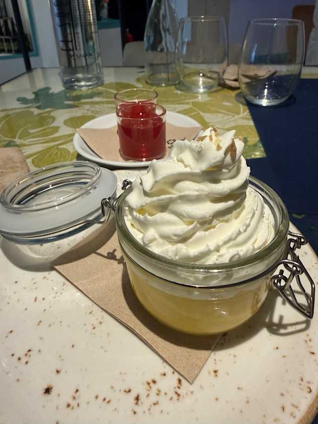 - Pavlova de coco, nata montada, salsa de frutas rojas